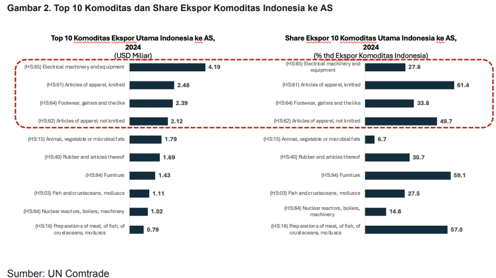 Berdasarkan Gambar 2, komoditas ekspor nonmigas Indonesia ke AS yang paling berpotensi terdampak adalah: Mesin dan perlengkapan elektrik (HS 85), Pakaian dan aksesoris rajutan (HS 61) & bukan rajutan (HS 62), Alas kaki (HS 64), Lemak dan minyak hewan/nabati (HS 15), Karet dan barang dari karet (HS 40). Sektor tekstil dan pakaian, yang merupakan ekspor dengan shares terbesar kedua untuk pasar AS, rentan terhadap tarif ini dan berpotensi menghadapi pengurangan ekspor dan dapat menyebabkan hilangnya pekerjaan.Mulai kuartal kedua 2025, kinerja ekspor khususnya pada produk tekstil dan alas kaki diperkirakan akan mengalami penurunan akibat kenaikan tarif bea masuk dan semakin menipisnya margin daya saing. Kondisi ini berpotensi memicu ancaman pemutusan hubungan kerja di industri padat karya, terutama di sektor sepatu dan garmen di Jawa Barat, apabila tarif tersebut bertahan lebih dari enam bulan. Sektor elektronik juga dapat mengalami penurunan permintaan karena peningkatan biaya. Demikian pula, industri alas kaki, yang mengekspor sebagian besar produknya ke AS, menghadapi tantangan daya saing yang besar. Bahkan komoditas seperti minyak sawit, yang merupakan ekspor utama Indonesia, dapat terpengaruh. Secara keseluruhan, tarif ini mengancam surplus perdagangan Indonesia dengan AS.