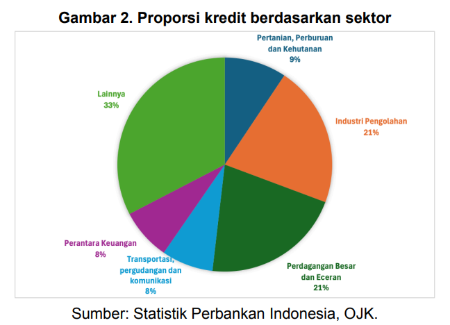 Kredit perbankan Indonesia secara agregat masih terkonsentrasi pada sektor perdagangan besar dan eceran, industri pengolahan, serta konstruksi, dengan porsi gabungan sekitar 20 persen pada periode Juni 2024 hingga Juni 2025. Meski sub sektor padat karya ekspor berada di dalam kelompok industri pengolahan, kontribusinya terhadap portofolio kredit perbankan nasional relatif kecil. Dengan demikian, risiko langsung dari tarif resiprokal terhadap stabilitas perbankan memang terbatas.