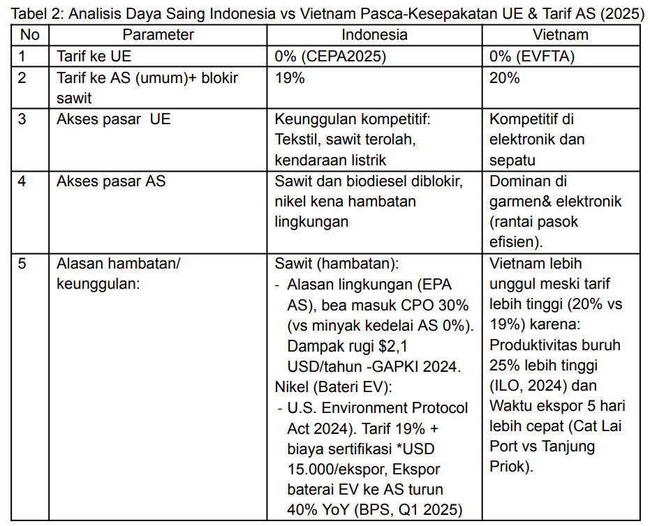 memastikan kesiapan institusional dan kebijakan nasional yang tangguh. Tanpa itu, Indonesia hanya akan menjadi pasar yang terbuka lebar bagi produk dan kepentingan negara lain tanpa mampu mengamankan nilai tambah yang berkelanjutan bagi ekonominya sendiri. Perjanjian dagang yang sehat semestinya membuka peluang, bukan memperdalam ketergantungan. Maka, evaluasi kritis terhadap setiap klausul dalam kesepakatan seperti ini menjadi keharusan agar Indonesia tidak sekadar menjadi objek dalam percaturan dagang global, tetapi mampu berdiri sebagai subjek yang menentukan arah dan manfaat dari keterlibatan internasionalnya. Dilain sisi, Indonesia tengah menjalankan strategi diversifikasi pasar melalui kesepakatan tarif nol persen dengan Uni Eropa yang tercapai setelah sepuluh tahun negosiasi antara Presiden Prabowo Subianto dan Presiden Komisi Eropa Ursula von der Leyen. Namun, meskipun upaya ini mencerminkan komitmen dalam diplomasi ekonomi global, kenyataannya daya saing Indonesia di berbagai sektor masih tertinggal dibandingkan negara seperti Vietnam yang lebih cepat memanfaatkan peluang pasar internasional berkat efisiensi logistik, biaya produksi yang lebih rendah, serta infrastruktur dan iklim investasi yang lebih mendukung. Hal ini dijelaskan melalui tabel 2.