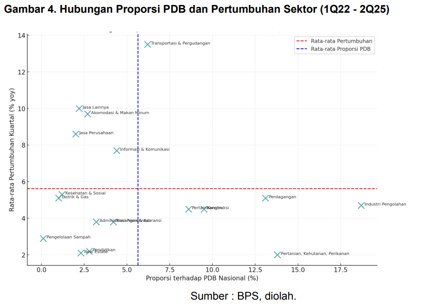 Selain itu, Grafik menunjukkan bahwa sektor-sektor dengan kontribusi besar terhadap PDB nasional justru mengalami pertumbuhan yang relatif rendah. Misalnya, Industri Pengolahan yang menyumbang sekitar 18,7% terhadap PDB hanya tumbuh rata-rata 4,7%, sementara Pertanian, Kehutanan, dan Perikanan dengan kontribusi 13,8% terhadap PDB bahkan hanya tumbuh 2,0%. Sebaliknya, sektor-sektor jasa seperti Transportasi dan Pergudangan yang kontribusinya 6,2% mampu tumbuh pesat hingga 13,5%, begitu pula Jasa Lainnya dengan pertumbuhan 10,0% meski proporsinya lebih kecil. Kondisi ini mencerminkan adanya ketidakseimbangan antara share terhadap PDB dan tingkat pertumbuhan, di mana sektor-sektor besar yang seharusnya menjadi motor utama ekonomi justru menunjukkan kinerja yang melambat. Jika tren ini berlanjut, daya saing nasional akan tertekan, sehingga dibutuhkan reformasi kebijakan yang mampu mendorong akselerasi pertumbuhan di sektor-sektor utama, terutama industri pengolahan dan pertanian, melalui deregulasi, insentif fiskal, dan adopsi teknologi yang lebih luas. Memperkuat daya saing lokal Indonesia Untuk memperkuat daya saing industri lokal, diperlukan sinergi antara kebijakan pemerintah, kesiapan pelaku usaha, dan dukungan ekosistem bisnis. Salah satu faktor penting adalah akses permodalan yang mudah dan terjangkau, misalnya melalui program Kredit Usaha Rakyat (KUR) dengan bunga rendah yang membantu pelaku usaha kecil dan menengah memperluas produksi, meningkatkan kapasitas, serta mengadopsi teknologi baru. Selain itu, peningkatan infrastruktur dan efisiensi logistik juga berperan besar, karena ketersediaan jalan, pelabuhan, energi, dan sistem distribusi yang efisien dapat menurunkan biaya produksi dan membuat produk lokal lebih kompetitif dibandingkan impor.